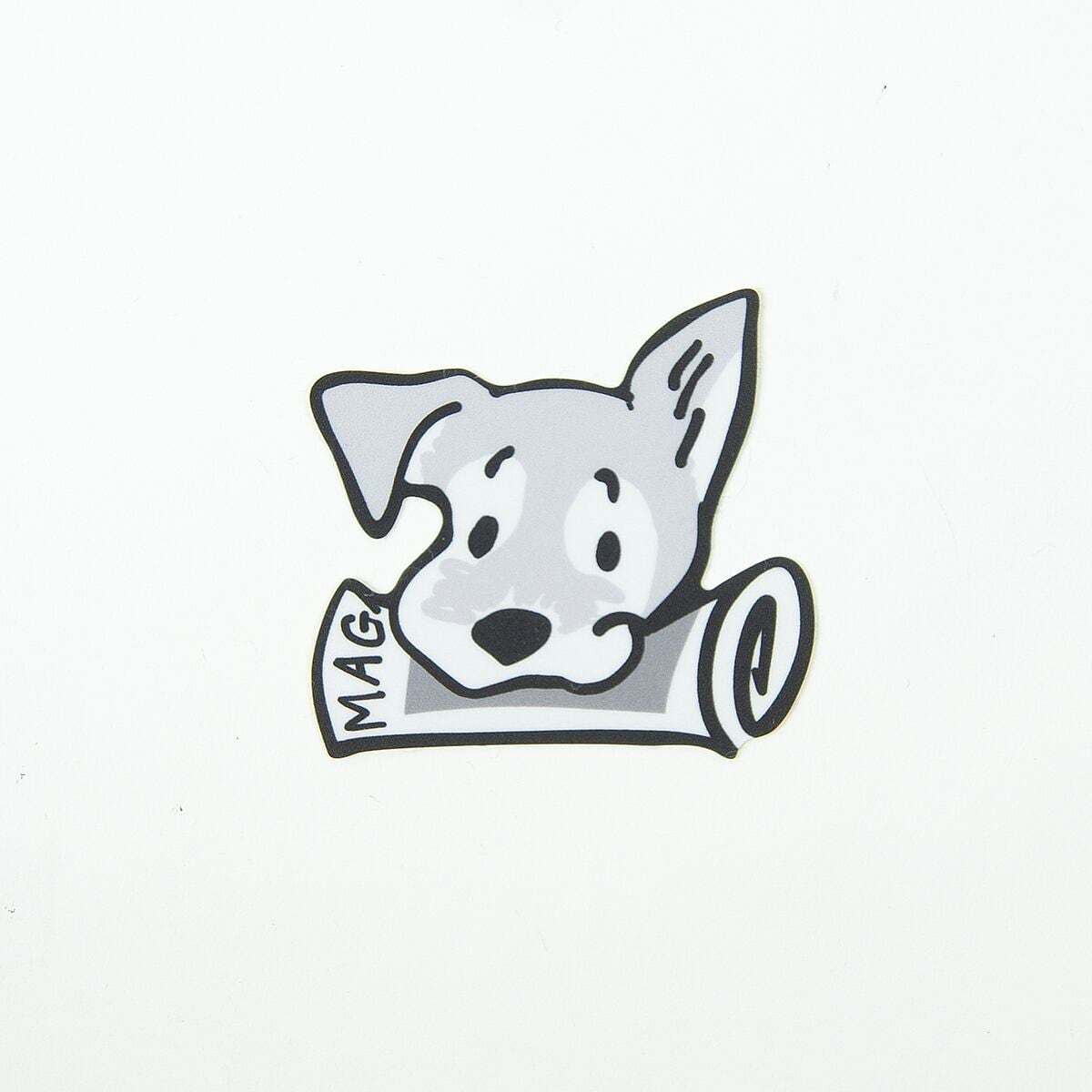 看板犬のZASSHU (雑誌を咥えた雑種犬の"ザッシュ")のステッカー。